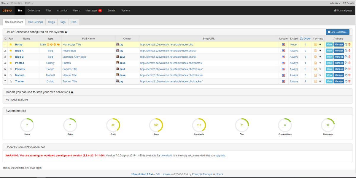 - Multiple blogs: Operate and maintain multiple blogs or websites within a single b2evolution installation