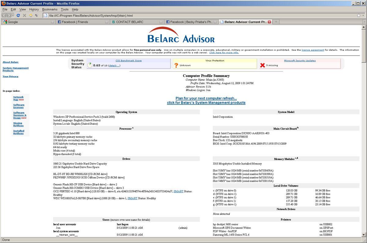 The Belarc Advisor is a software application that generates a comprehensive report of a user's installed hardware, software, and security vulnerabilities within their web browser. The report provides detailed information about the client's network inventory, missing Microsoft hotfixes, anti-virus status, and security benchmarks, all of which are displayed directly in the user's web browser. Importantly, the user's PC profile information is kept private and is not transmitted to any external web server