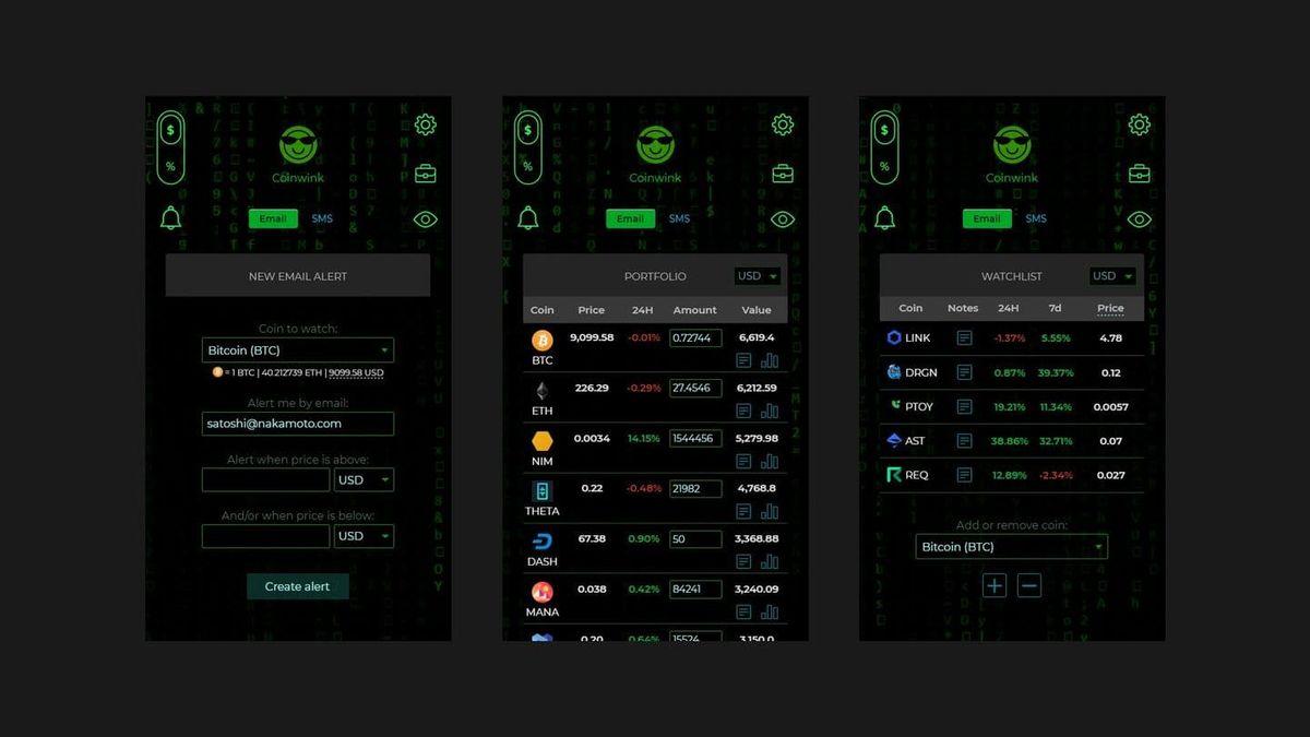 Coinwink is an open-source, privacy-focused cryptocurrency price alerts service. It provides fast, free, and secure email, SMS, and Telegram notifications for Bitcoin, Ethereum, and over 3,600 other digital currencies. Users can create custom price alerts, set alarms, and track their cryptocurrency holdings and watchlists across multiple fiat currencies, including BTC, ETH, EUR, GBP, AUD, CAD, BRL, MXN, JPY, and SGD