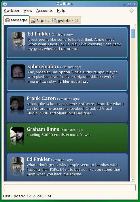 Gwibber is a multifunctional open source microblogging client developed for the GNOME desktop environment using Python and GTK. It integrates several leading social networking platforms, enabling users to access and manage their online interactions from a centralized interface. Gwibber supports a broad range of services, including Twitter, Identi.ca, StatusNet, Facebook, Flickr, Digg, FriendFeed, and Qaiku, consolidating messages and updates from these various sources into a unified stream. The application provides users with a range of practical features, such as automated URL shortening, built-in search capabilities, and support for saved searches. Additionally, Gwibber offers customization options, allowing users to apply HTML-based themes to personalize the application's visual appearance. The user interface is designed with a multicolumn layout, facilitating the simultaneous viewing of multiple social media feeds