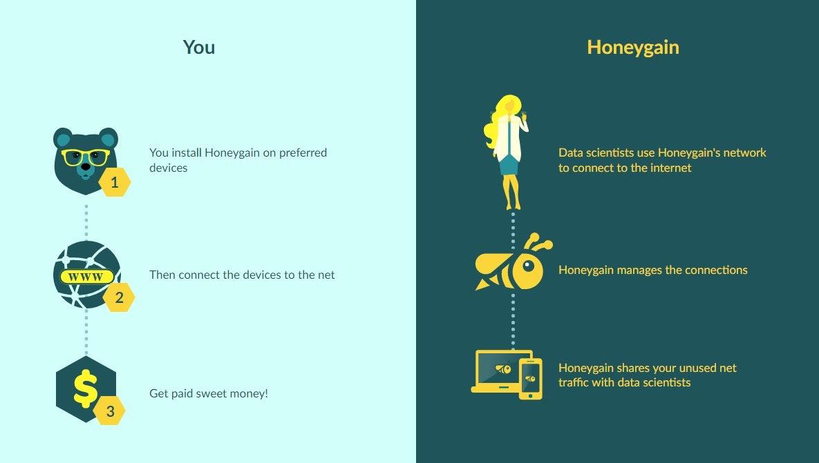 The app enables users to monetize their unused internet bandwidth by sharing it through their devices. It transforms devices into gateways, allowing users to earn passive income by contributing their surplus network capacity