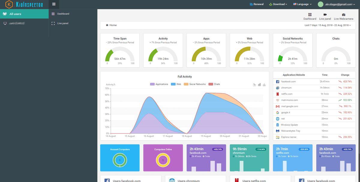 KidInspector is a comprehensive parental control software that allows parents to monitor their children's digital activities across a range of devices, including computers, smartphones, and tablets. The software provides a suite of features to help parents keep their children safe online, such as the ability to track messages, calls, WhatsApp conversations, and Facebook activity. With KidInspector, parents can capture chats and messages, record video and audio, broadcast webcam and screen live, and log keystrokes, giving them a detailed picture of their children's online interactions. The software is available on iOS, Android, Windows, and Mac platforms, and offers a wide range of options for controlling children's access to the internet, including the ability to block specific websites or entire categories of content. The activity reports generated by KidInspector are presented in a user-friendly format, with graphs, charts, images, and text, allowing parents to access real-time information on their children's device usage from any location