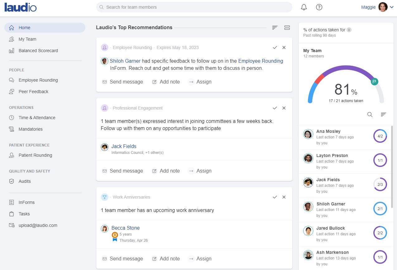 The Laudio platform offers a comprehensive leader operation solution designed to alleviate the burden on frontline leaders in healthcare. Through real-time insights and actionable recommendations, the platform enables personalized engagement between managers and their teams, streamlining operations and driving positive outcomes