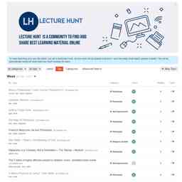 Lecture Hunt is a platform that enables users to discover and share a diverse array of online learning resources. Through this community-driven approach, individuals can access a vast repository of educational content, including books, videos, articles, and courses, all curated and contributed by fellow users. With Lecture Hunt, users can easily explore and engage with a wide range of high-quality learning materials, empowering them to expand their knowledge and skills across various subjects and disciplines