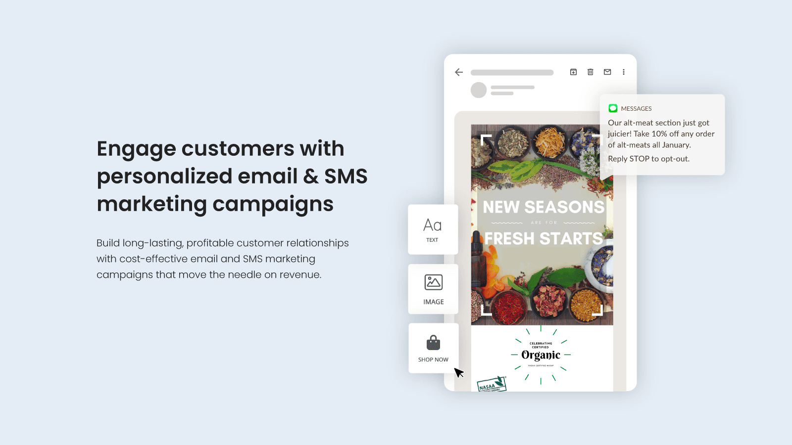 - Email and SMS marketing campaigns with marketing automation capabilities