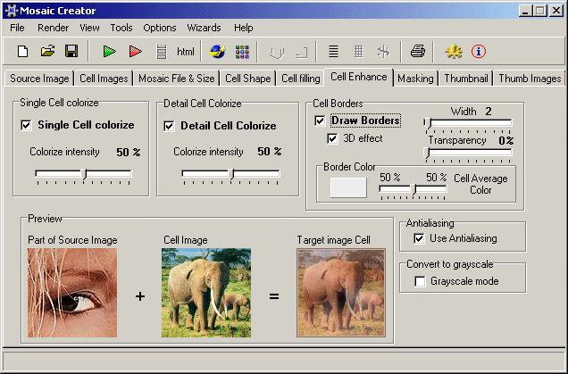 Mosaic Creator is a versatile tool that enables users to transform digital images into unique mosaic artworks. The application provides a comprehensive set of features, allowing for the creation of customizable mosaics with an unlimited number of cells. Users can experiment with various cell shapes, including puzzle pieces, triangles, and hexagons, to achieve distinct visual effects. The tool offers a wide range of options to control the distribution and rendering of the mosaic elements, ensuring precise control over the final outcome. The resulting mosaic images can be created at any desired size, with no limitations on the number of source images utilized. Furthermore, the application supports the use of alpha masks and color masks, enabling advanced image enhancement techniques to be applied to the final mosaic composition