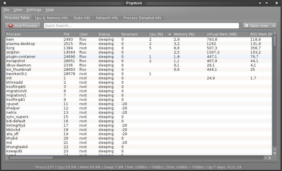 Python System Monitor (Psymon) is a cross-platform application that provides users with a comprehensive view of their system's performance and task management. The tool offers global processes monitoring, enabling users to track and analyze the activities of various processes running on their system. Additionally, Psymon provides a detailed history of system load, including CPU, memory, network, and disk usage, allowing users to monitor and understand the resource consumption patterns over time. The application also offers detailed information about connected network interfaces and disks, giving users a clear understanding of their system's hardware and connectivity. Furthermore, Psymon presents users with detailed process-level information, including CPU and memory usage percentages, enabling them to identify and optimize resource-intensive tasks