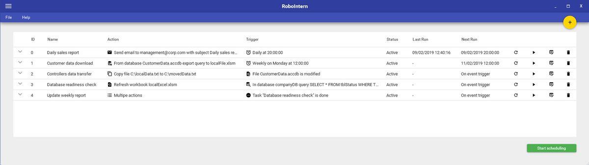 RoboIntern is a comprehensive automation and scheduling software designed to streamline repetitive office tasks. Its user-friendly interface allows effortless management of a wide range of operations, including Microsoft Excel, Word, and Access tasks, email handling, ODBC database integration, PDF manipulations, and FTP file transfers. The software's versatility empowers users to automate a multitude of routine workflows, eliminating the need for manual interventions and enhancing overall productivity. Whether triggered manually or set to run on predefined schedules, the automation features of RoboIntern ensure efficient task completion, freeing up valuable time for more strategic initiatives
