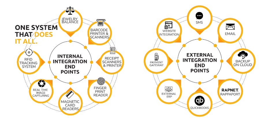 - Automates tasks with fingerprint, RFID, jewelry scale, Kitco gold price, Rappaport pricing, magnetic card readers, SMS, and email