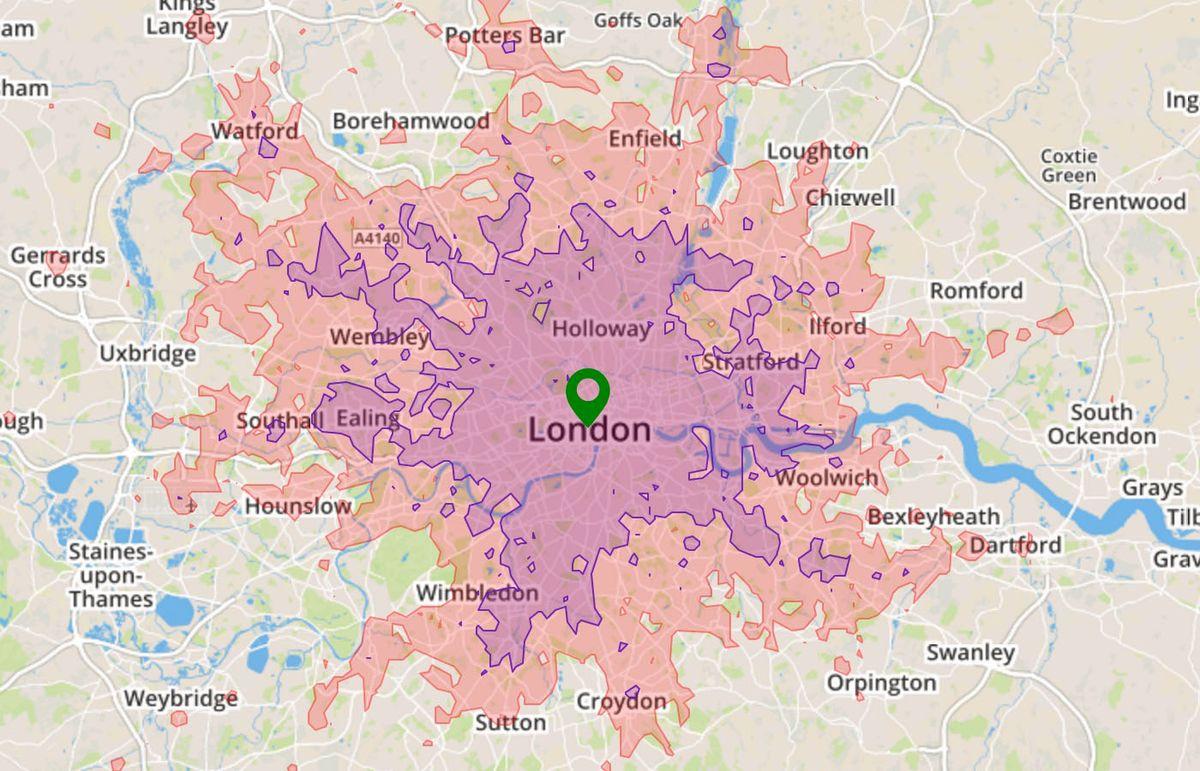 - Catchment area generation: TravelTime can create detailed catchment areas around a given origin point, taking into account actual travel routes and user preferences, rather than relying on a simple radius